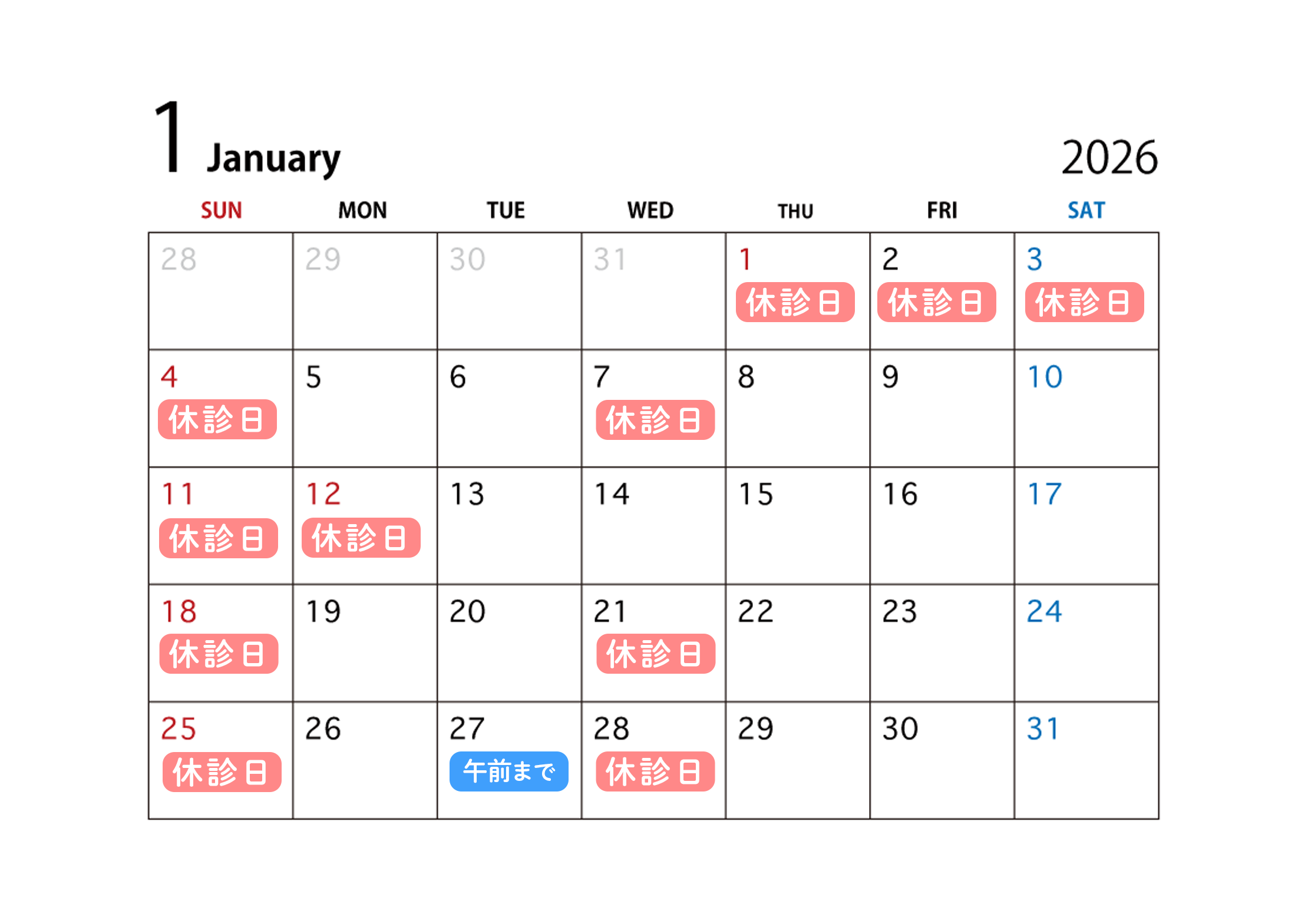 2026年1月の診療日は、1月1日(水)、2日(金)、3日(土)、4日(日)、7日(水)、11日(日)、12日(月)、18日(日)、21日(水)、25日(日)、27日(火)午後、28日(水)が休診になります。 詳細は下記カレンダーをご参照ください。