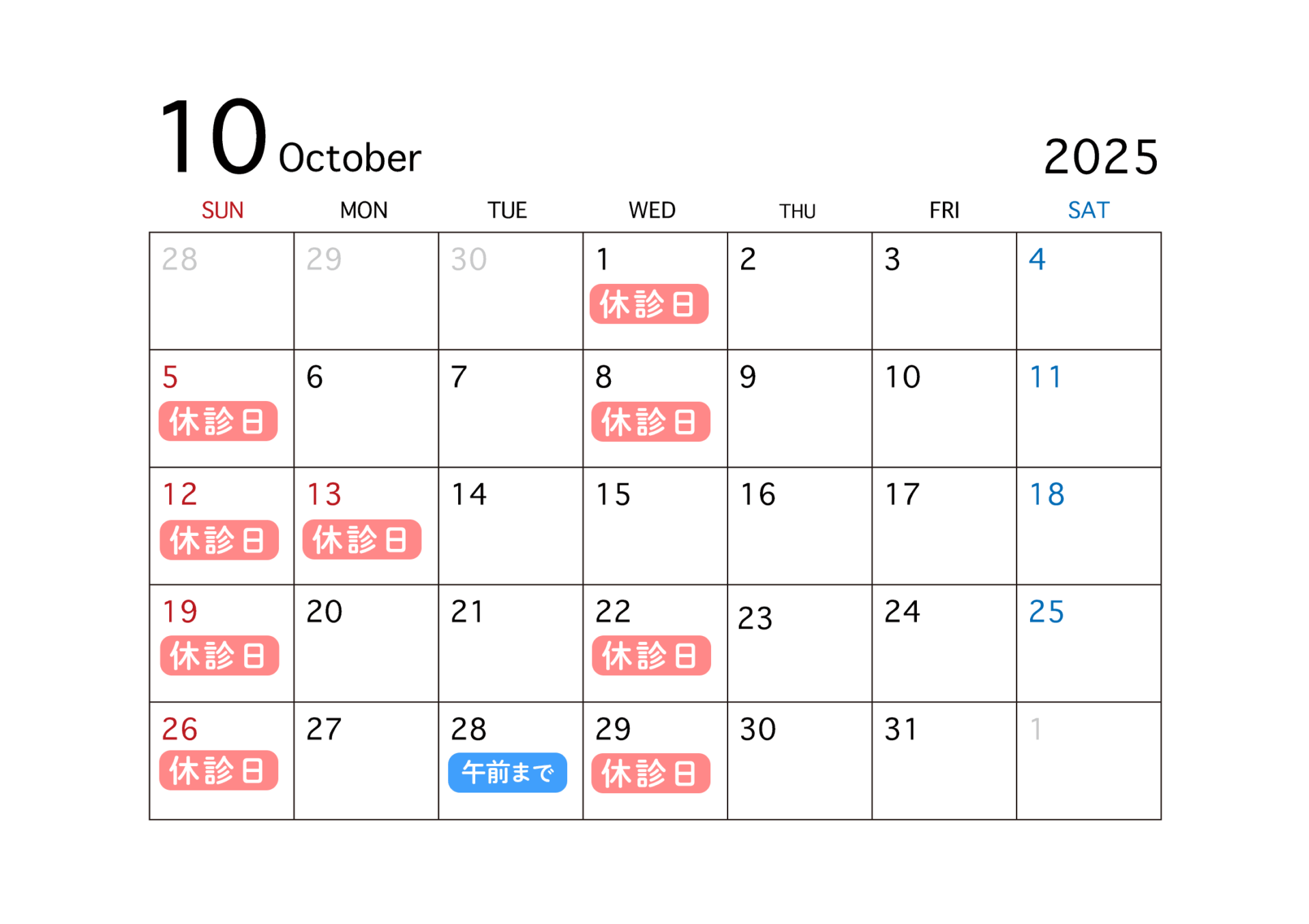 2025年10月の診療日は、10月1日(水)、5日(日)、8日(水)、12日(日)、13日(月)、19日(日)、22日(水)、26日(日)、28日(火)午後、29日(水)が休診になります。 詳細は下記カレンダーをご参照ください。