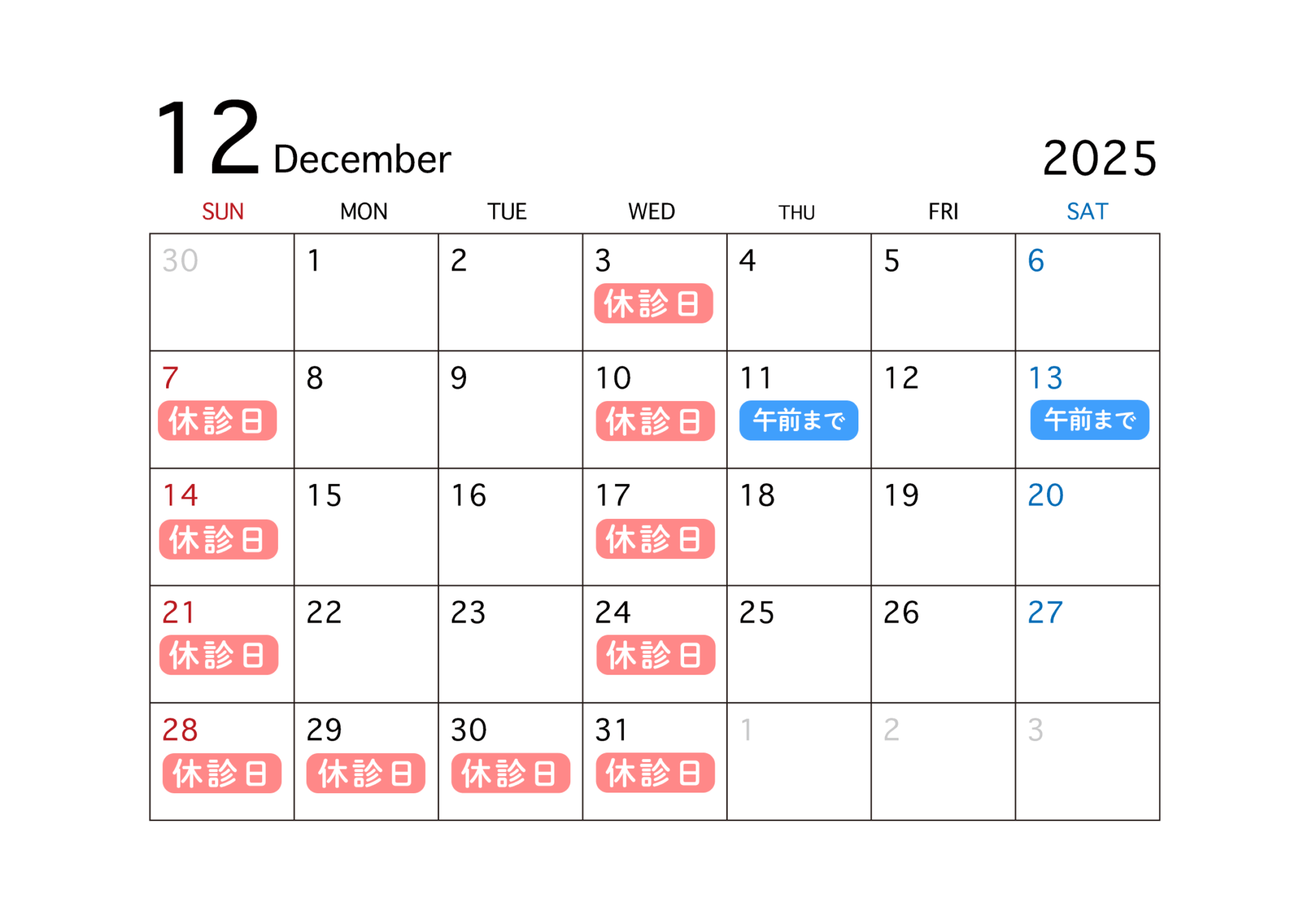 2025年12月の診療日は、12月3日(水)、7日(日)、10日(水)、11日(木)午後、13日(土)午後、14日(日)、17日(水)、21日(日)、24日(水)、28日(日)、29日(月)、30日(火)、31日(水)が休診になります。 医院都合により11日(木)は13時まで、13日(土)は11時30分までの診療となります。 詳細は下記カレンダーをご参照ください。